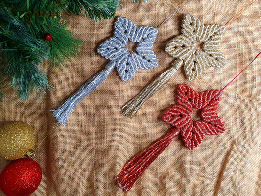 Shiny boho macrame star Christmas hanging baubles, gold silver red Christmas star tree hangings, festive decor, holiday decorations, stars