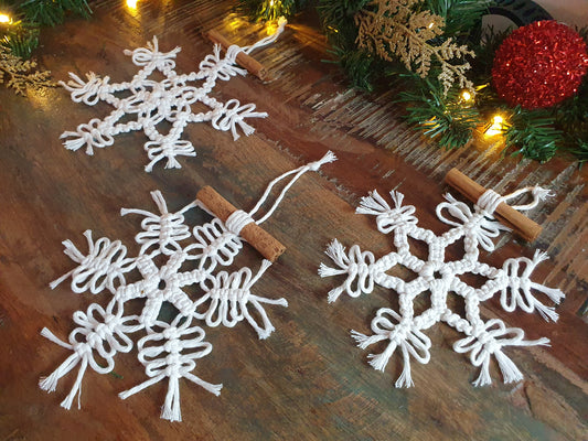 Set of 3 cinnamon snowflakes, chrismas macrame white tree ornament decor minimalist stocking stuffer filler secret santa boho bauble hanging