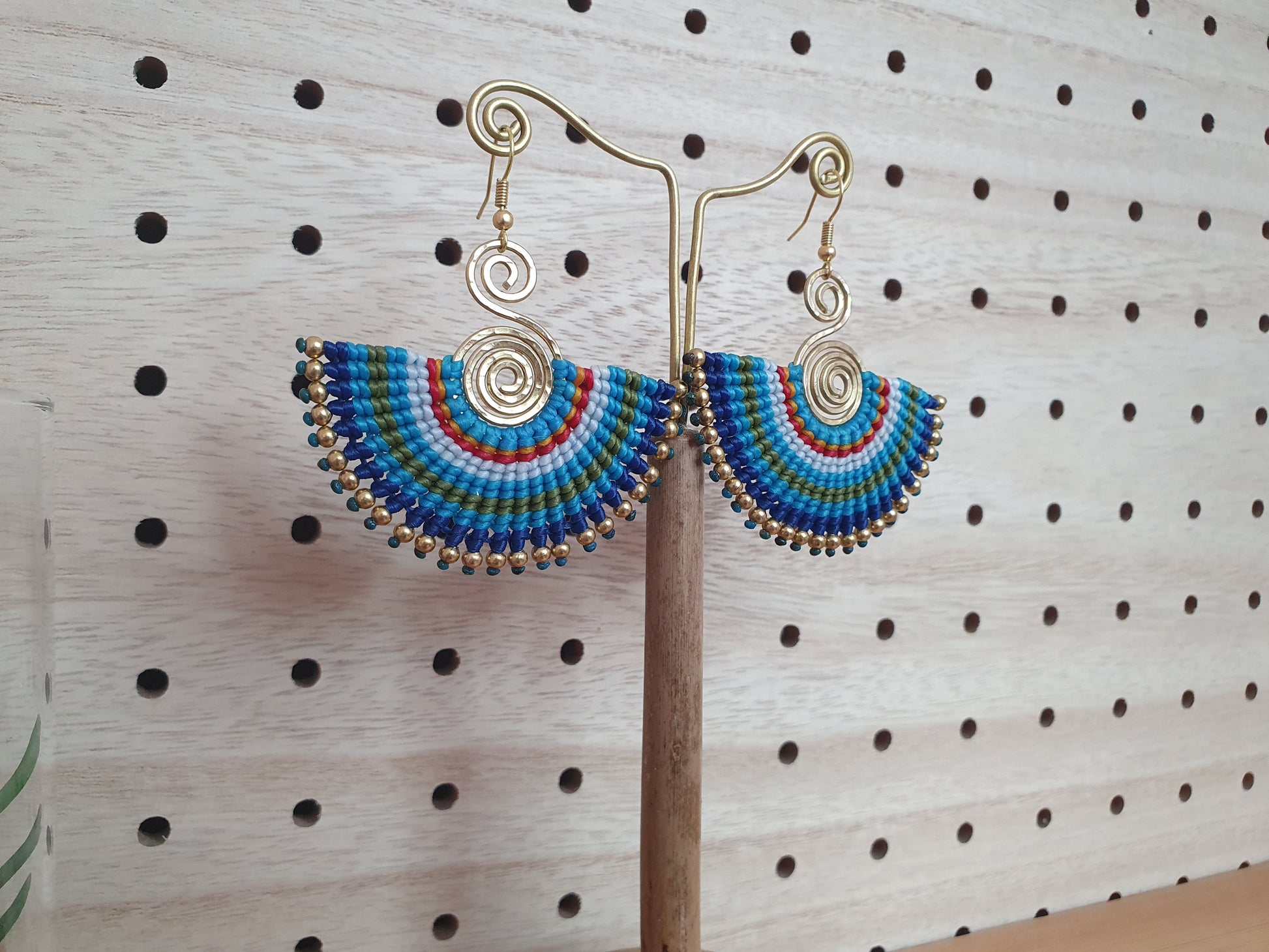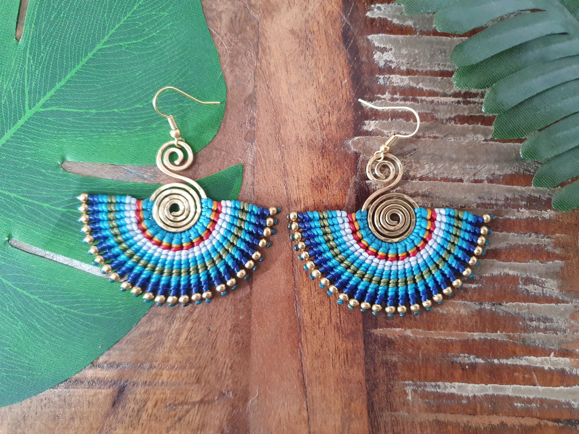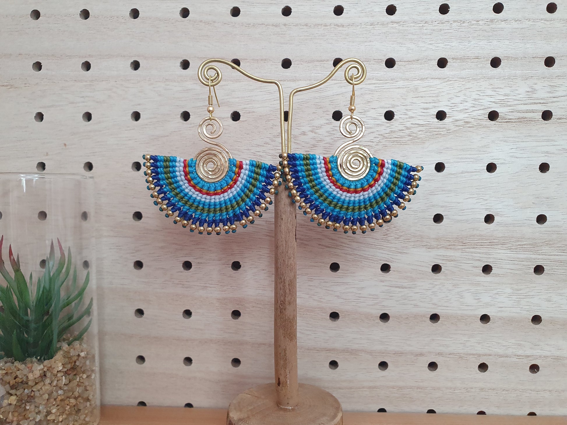 You are looking at beautiful, half-moon golden brass wire wrapped earrings featuring blue macramé waxed cord with complimentary accents in red, yellow, green & white, and finished with gold brass beads.