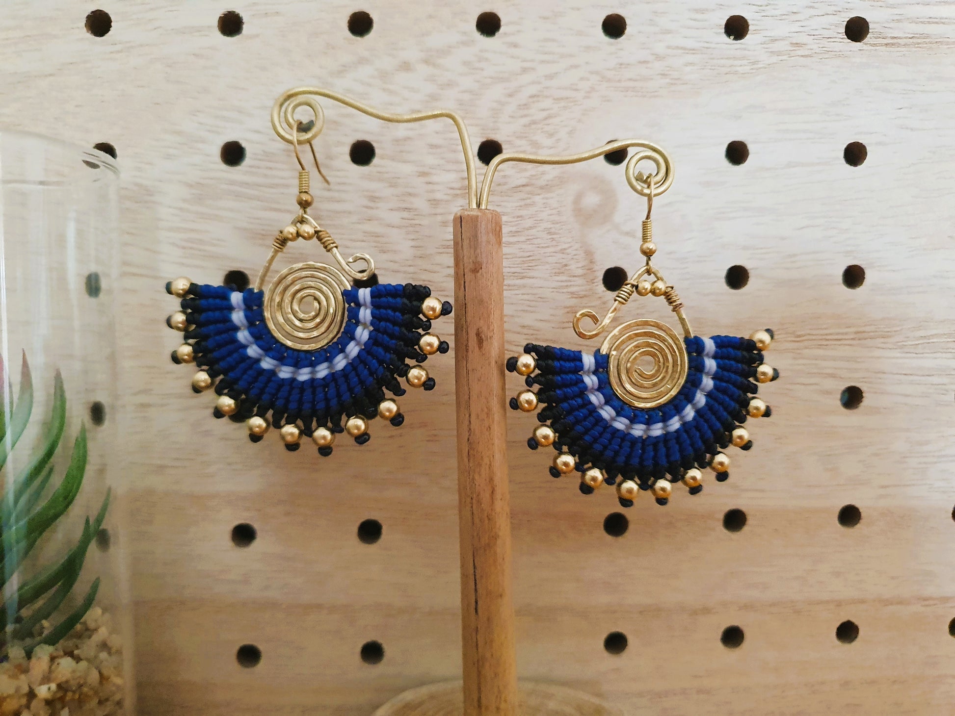 Blue macramé earrings,indigo earrings,wire wrap earrings,gold wire earrings,spiral earrings,thai earrings,handmade earrings,boho earrings