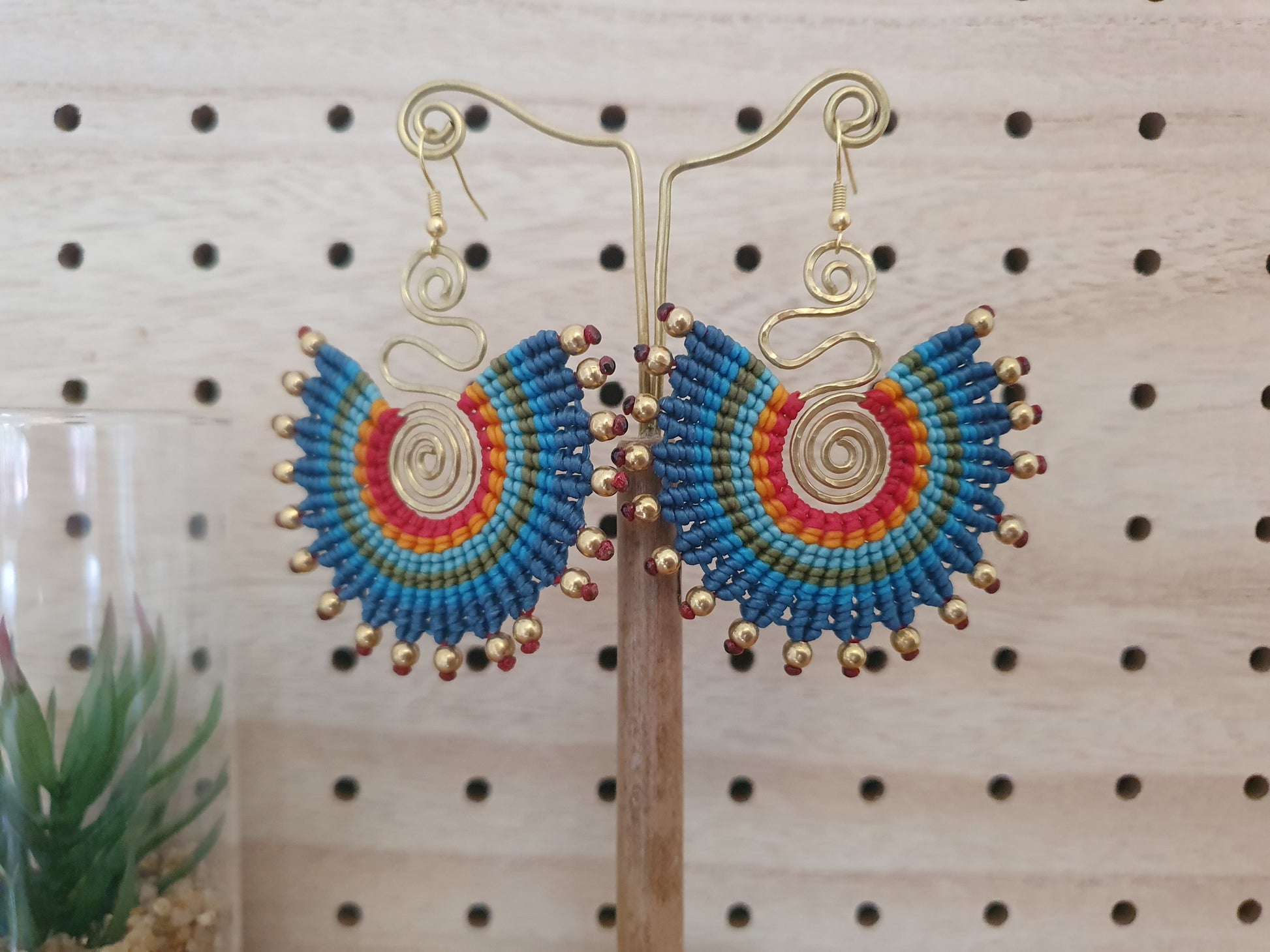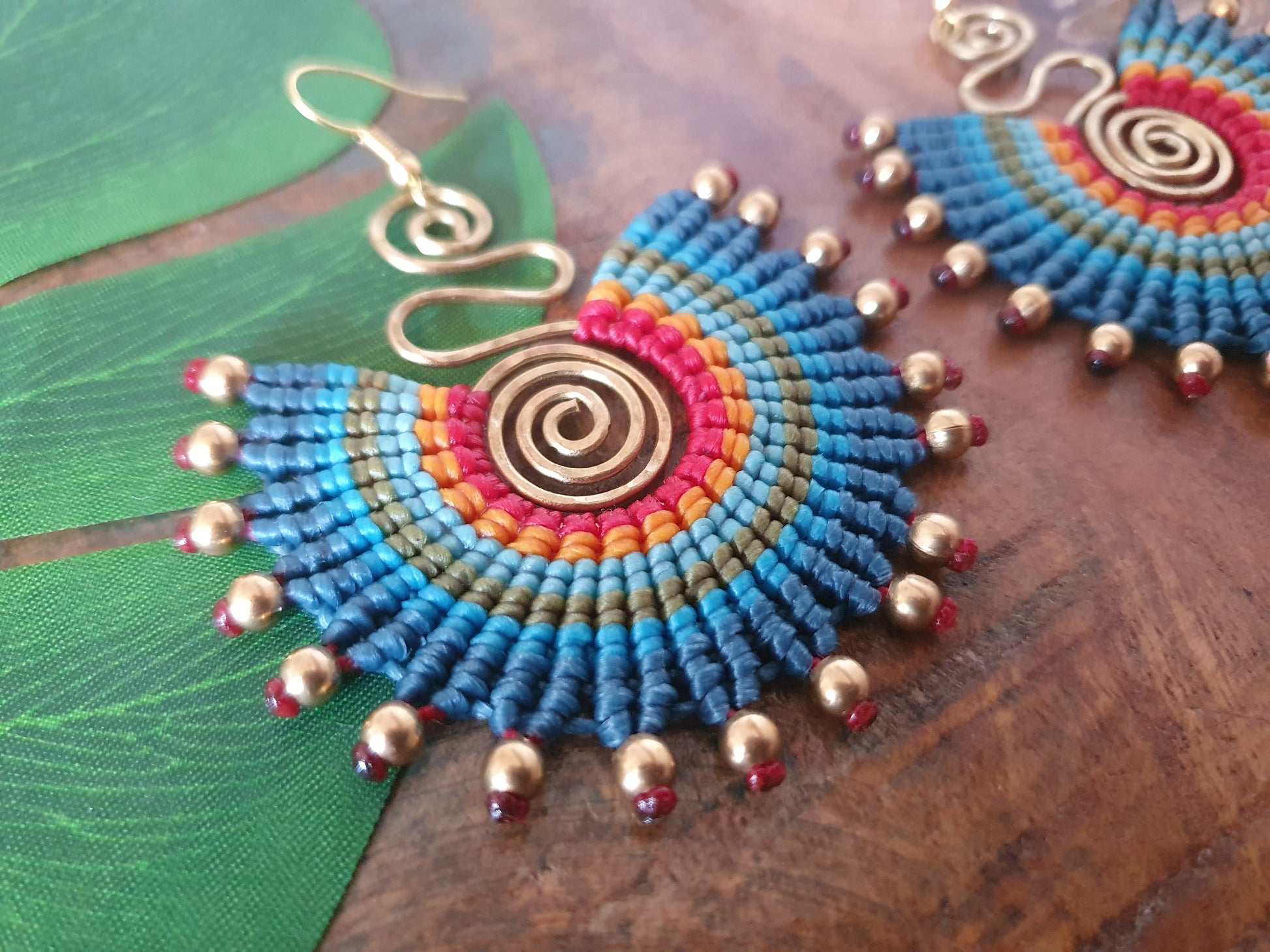 Handmade by Own, they feature our signature golden spiral with a funky twist at the top, 'full moon' macrame in red, yellow, green and blue, and are graced with magnificent gold brass beads!