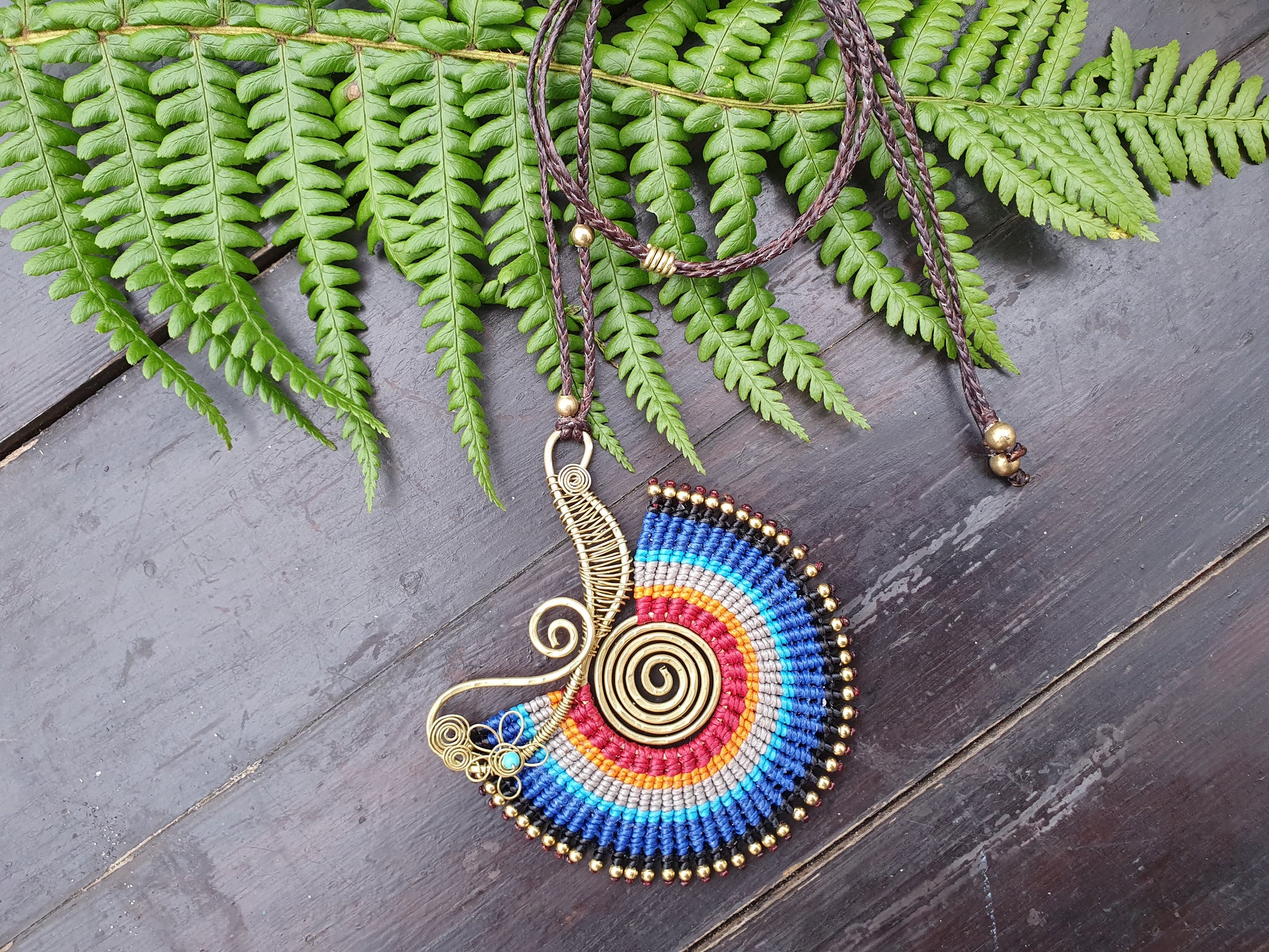 A gorgeous blue statement spiral pendant from Jasper Rocks featuring macramé waxed cord in blues, grey, orange and red! It also features ornate, hand-sculptured wire-art in a variety of styles including a turquoise centred daisy.