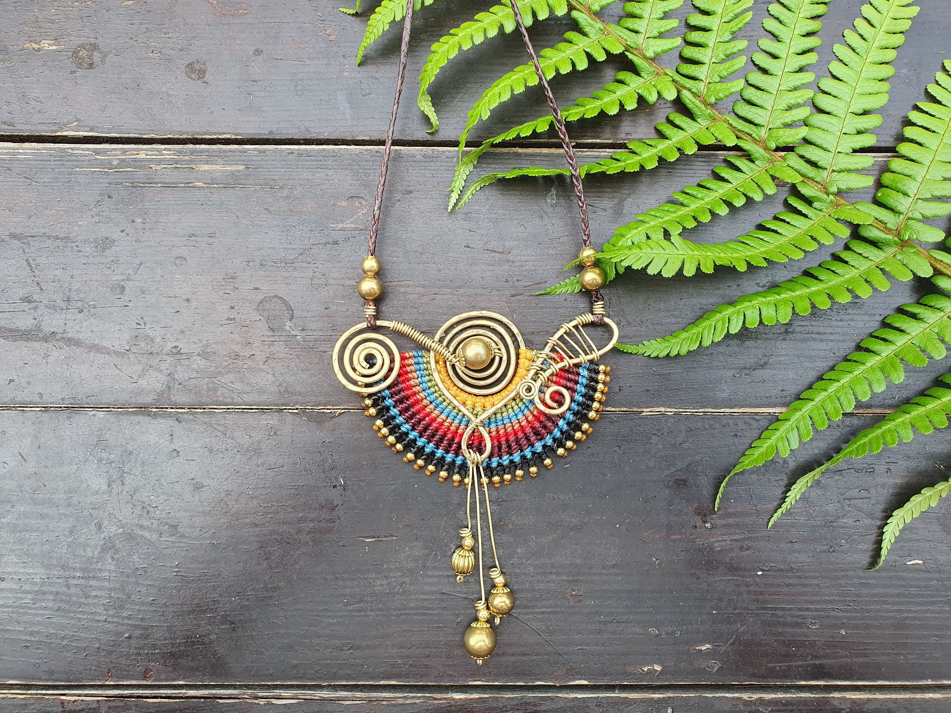 A stunning styling of golden brass wire spirals, long line suspended adornments with quirky twists, combined with Thai micromacrame in the alternative rainbow aesthetic you never knew you loved! Trust in this extraordinary boho necklace to awaken your inner bohemian goddess.