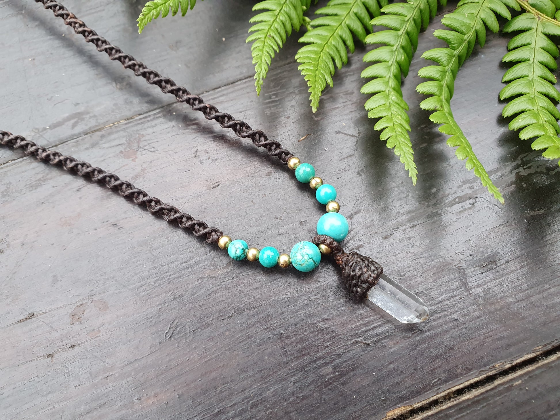 Small and stunning, charming and meaningful, this macrame-wrapped tribal talisman necklace features a mesmarising mini clear quartz tower gemstone at its centre, and is majestically flanked by turquoise crystals.
