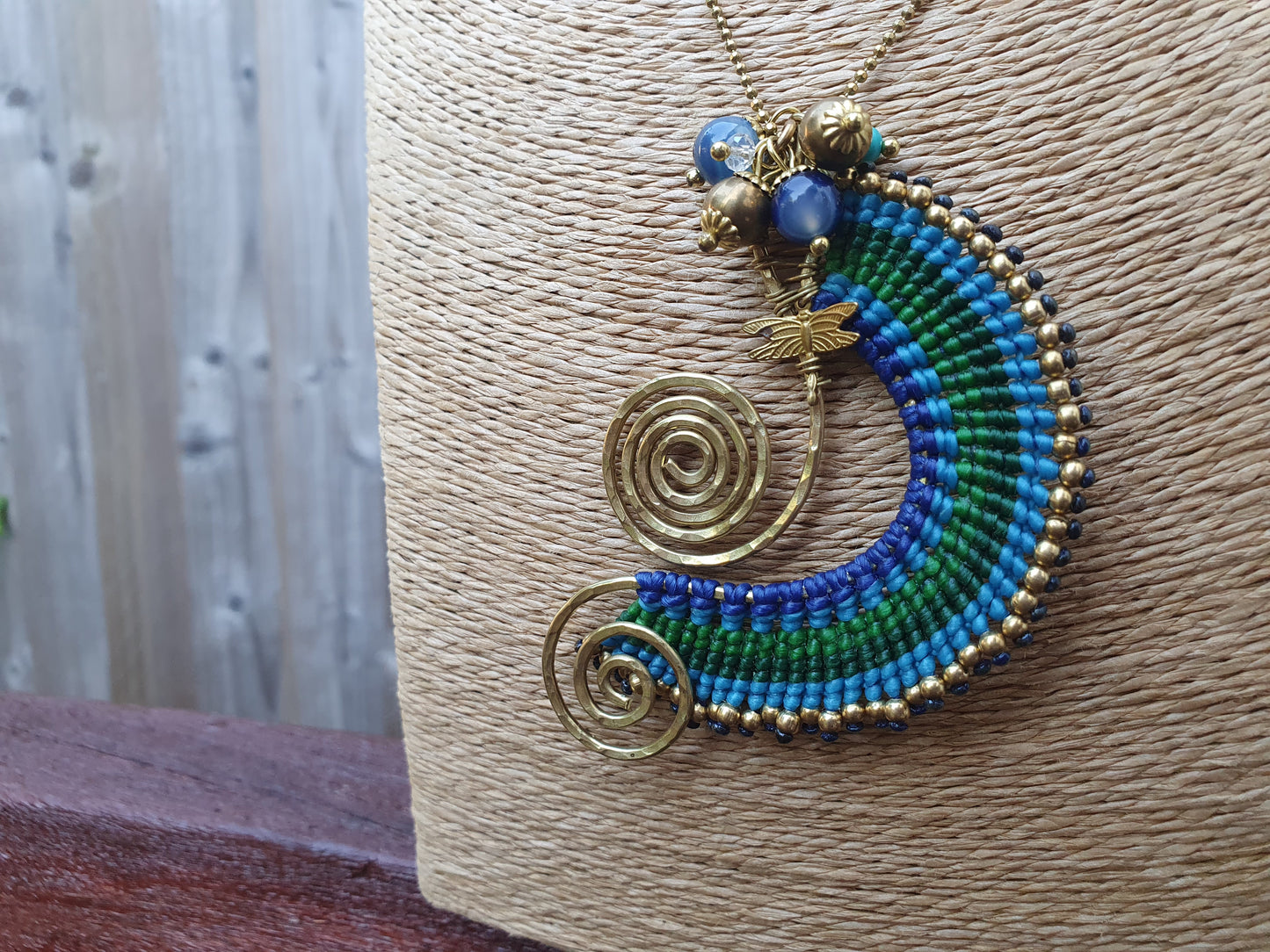 Our beach wave necklace. This gorgeous ode to the sea features spiral gold brass wire wrapped by macrame in sea blues and greens and a dragonfly charm. At the top of the pendant is a cluster of genuine:
