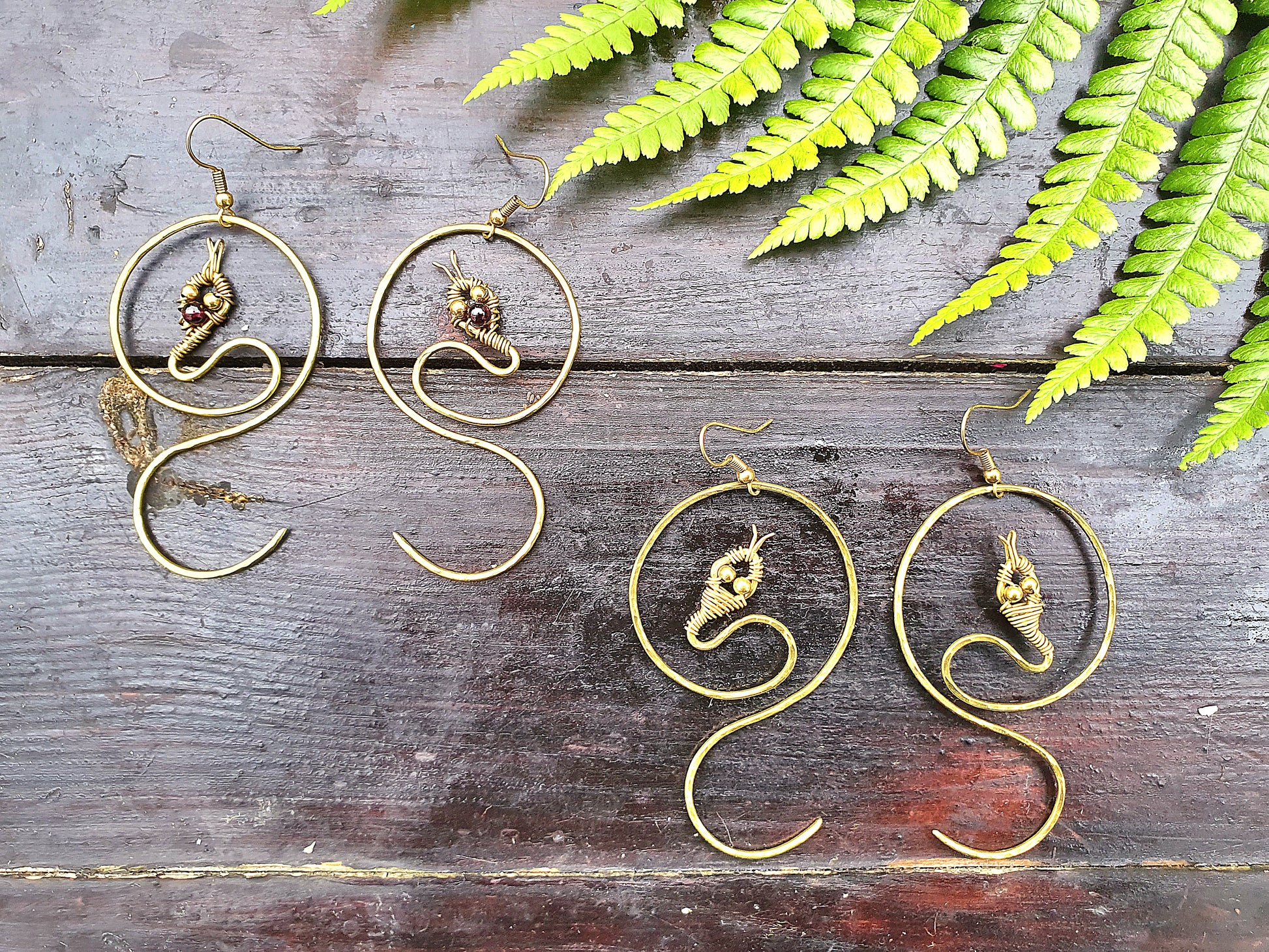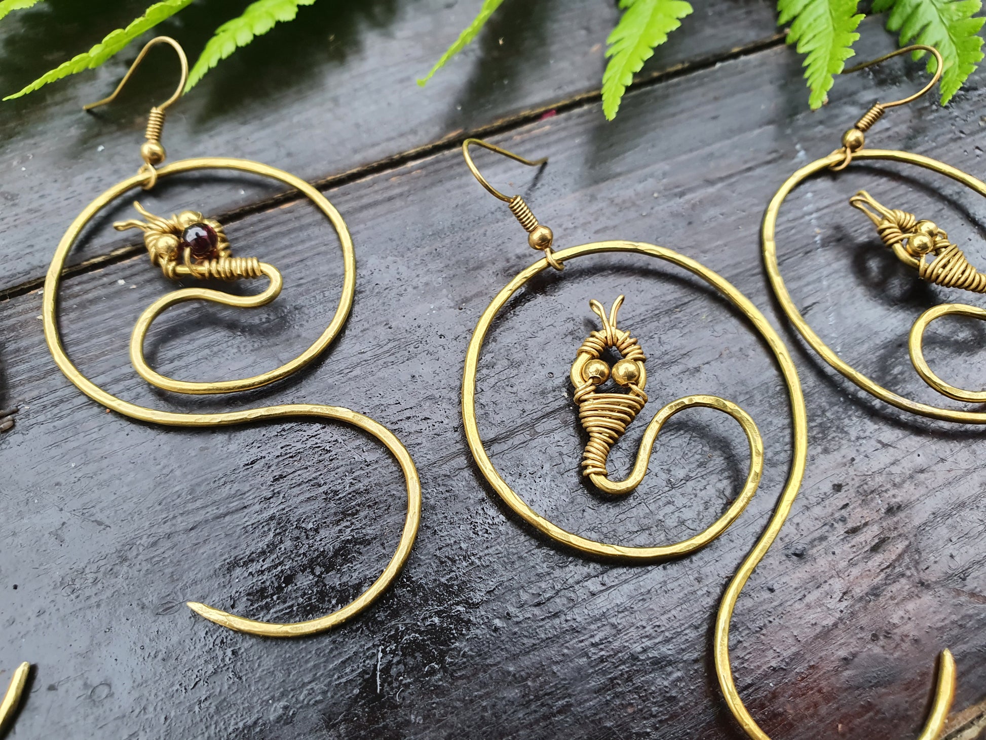 Luminous, magick garnet crystals make up the snakes' head adornment in the crystal option sample, and its body is solid brass wire, hammered by hand to leave a delicious textured finish that shines in the light.