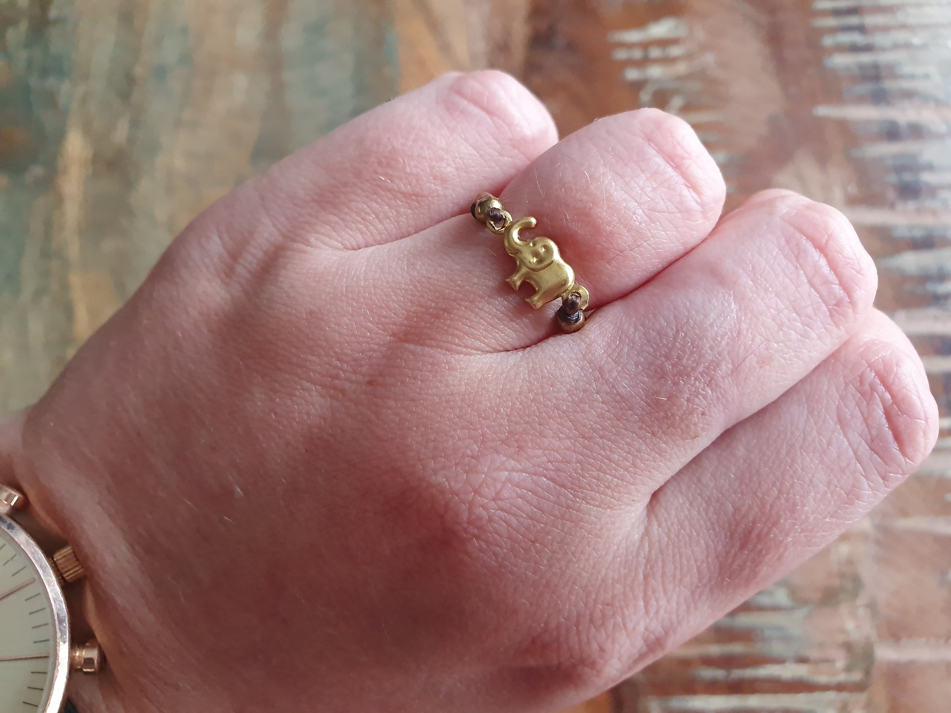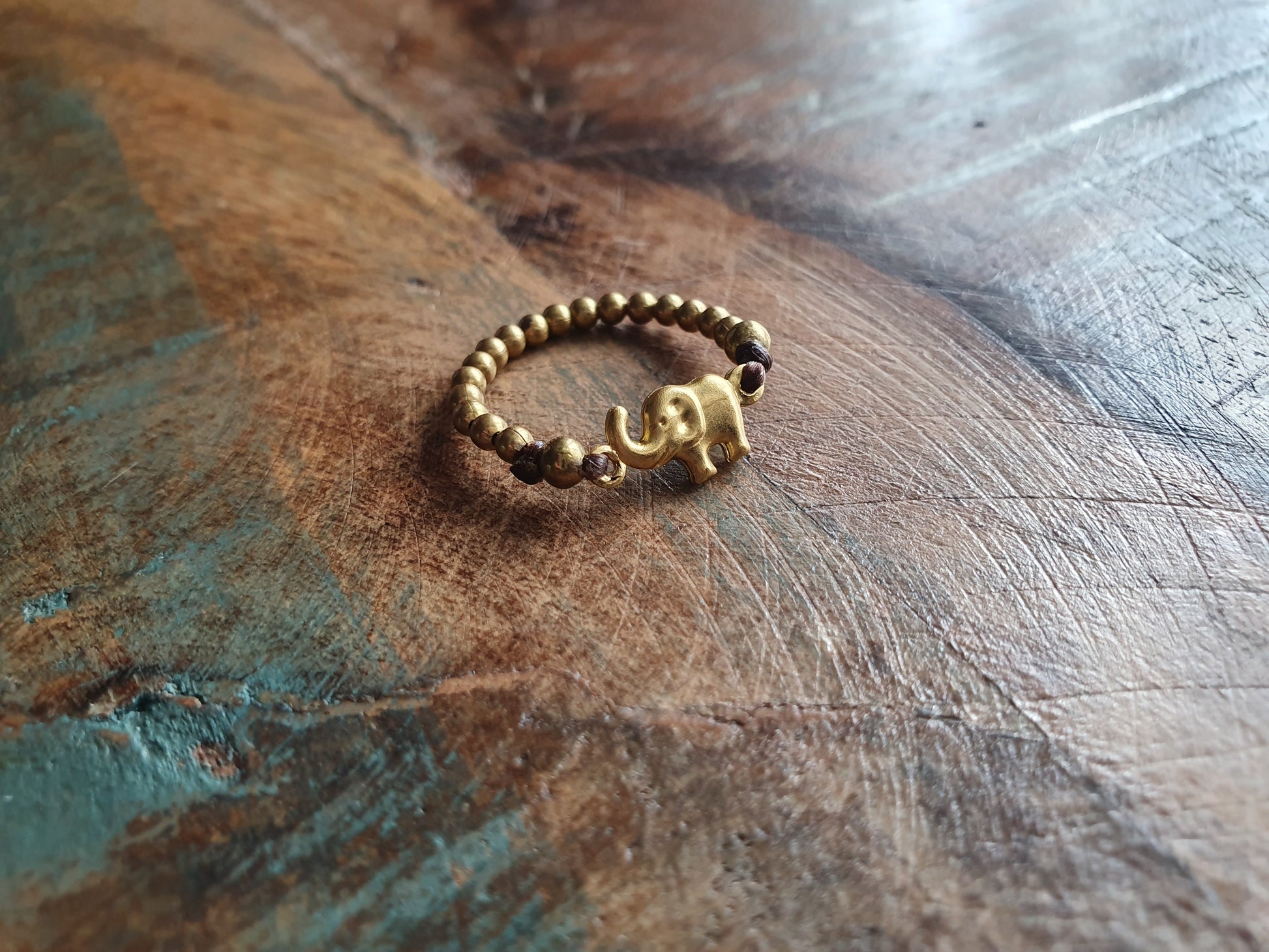 Here we have the chicest, the cutest gold brass elephant ring formed simply of a length of strong waxed cord, gold brass beads, and a gold brass elephant charm.