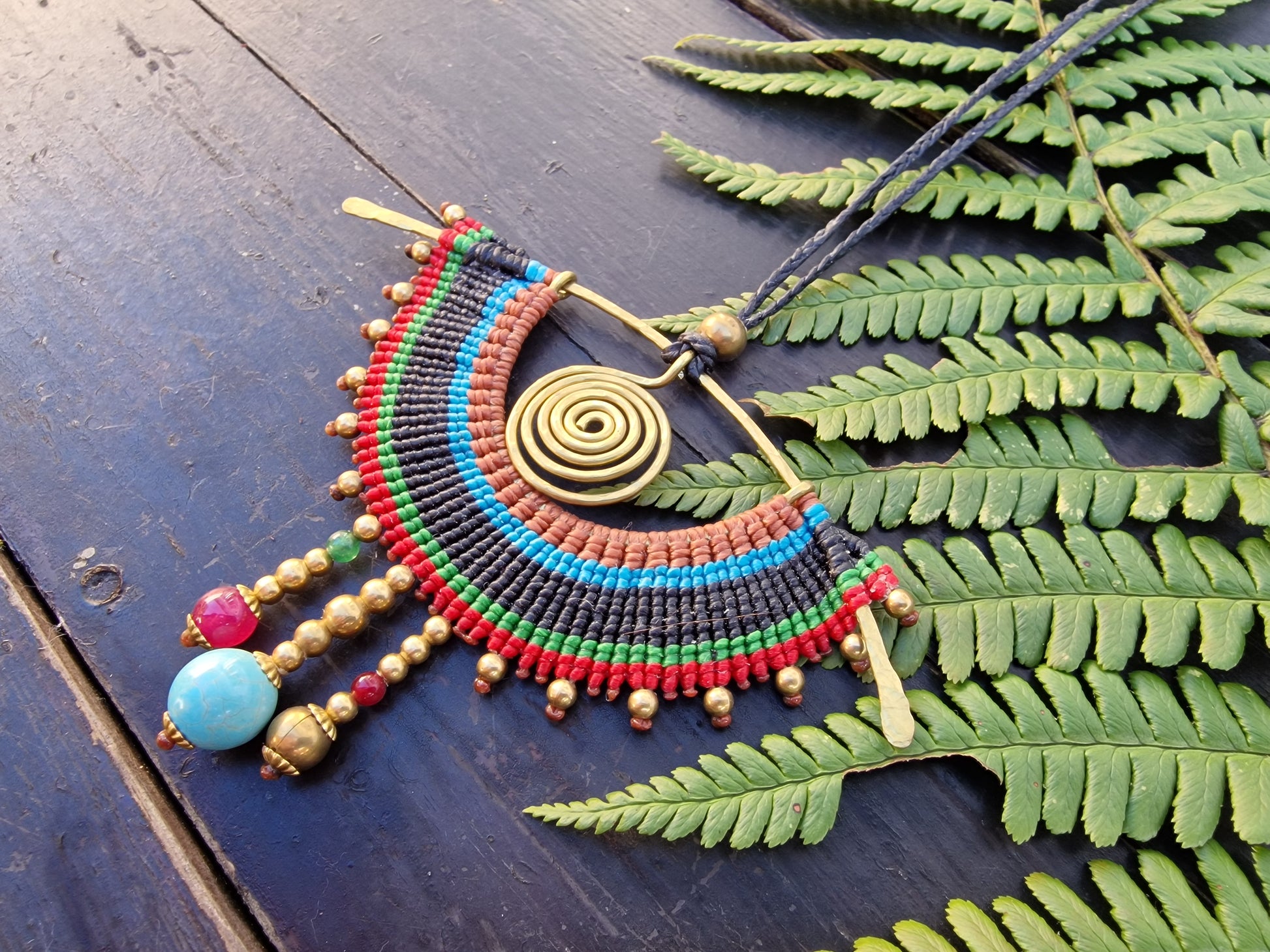 An incredibly unique and powerful tribal necklace of colourful macramé encircling sculpted brass wire and adorned with stones of turquoise, rubellite, jade and howlite!
