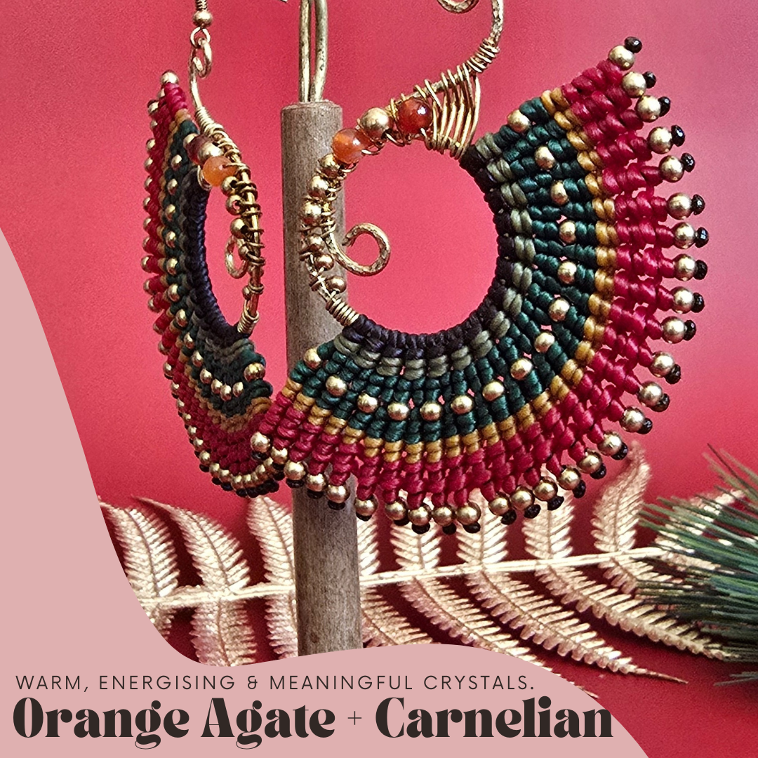 Festive Macrame Earrings in Red & Green, Orange Agate, Carnelian Crystals, Boho Christmas Statement Earrings, Spiral Holiday Jewellery