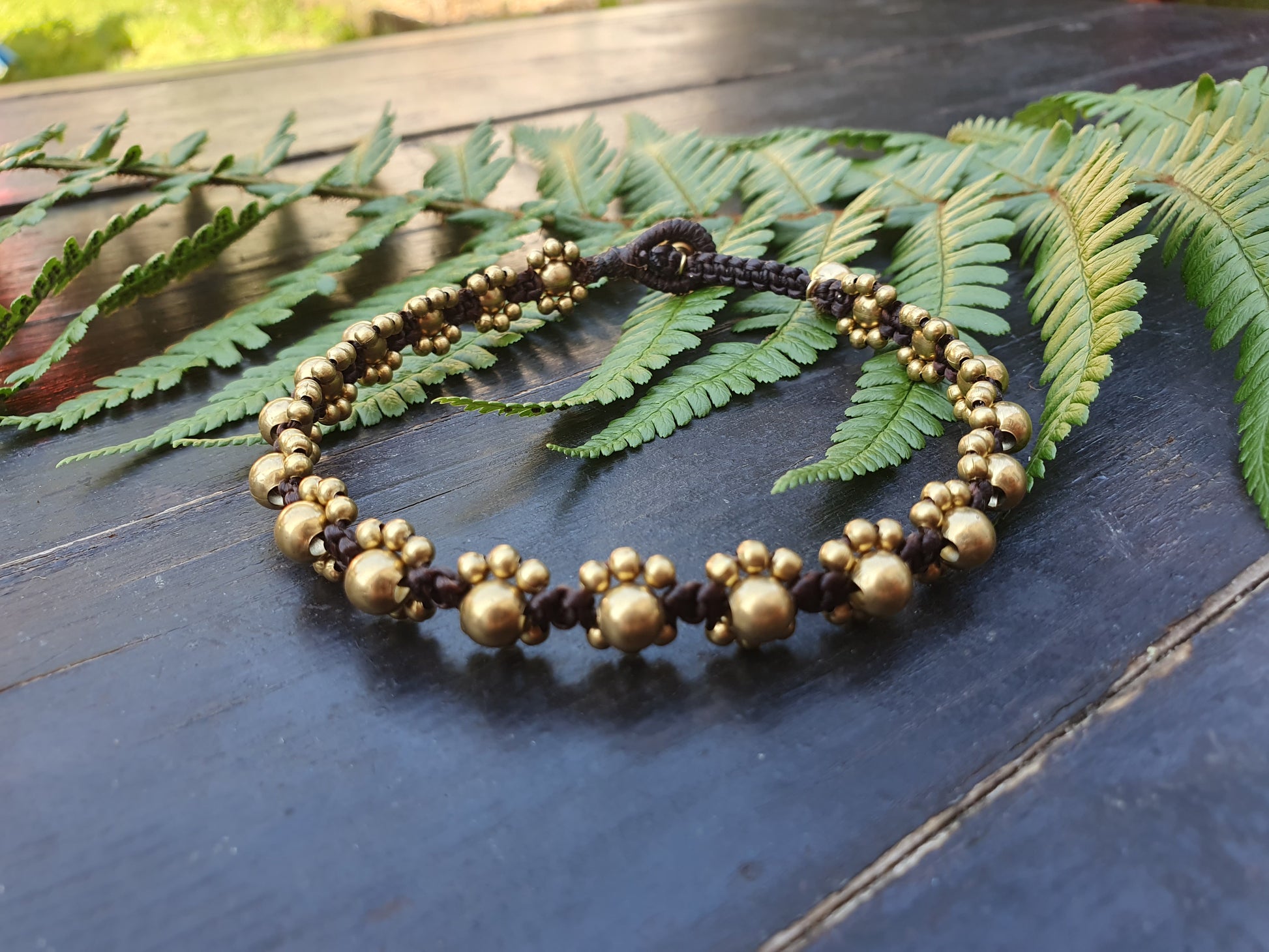 Handmade from dark brown macrame waxed cord, it features genuine solid brass beads encircled with smaller gold brass beads to envision daisy flowers!