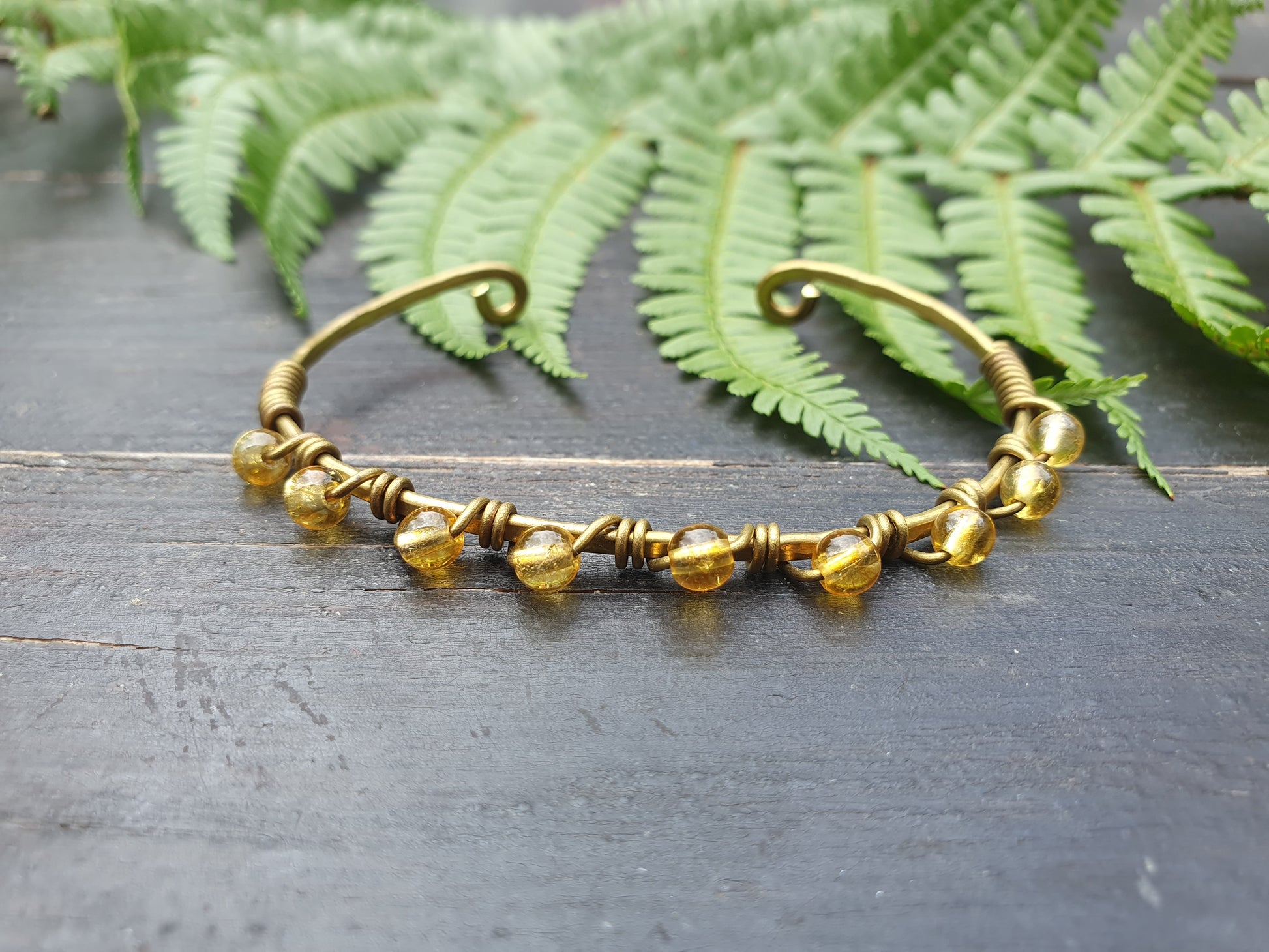 This handmade wire bracelet is made of high quality hammered gold brass wire, which is malleable enough to fit onto the wrist and pinched together to your desired fit. It can easily be adjusted but will still hold the circular shape.
