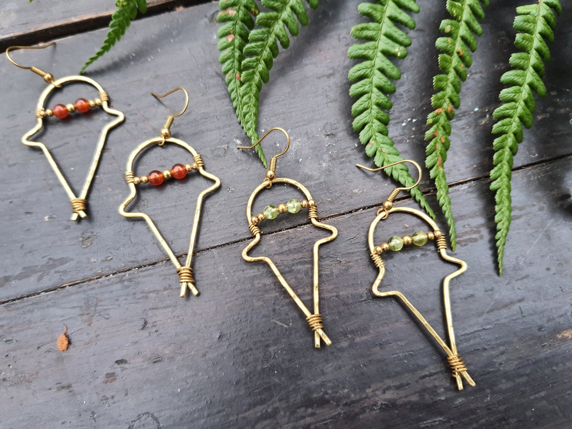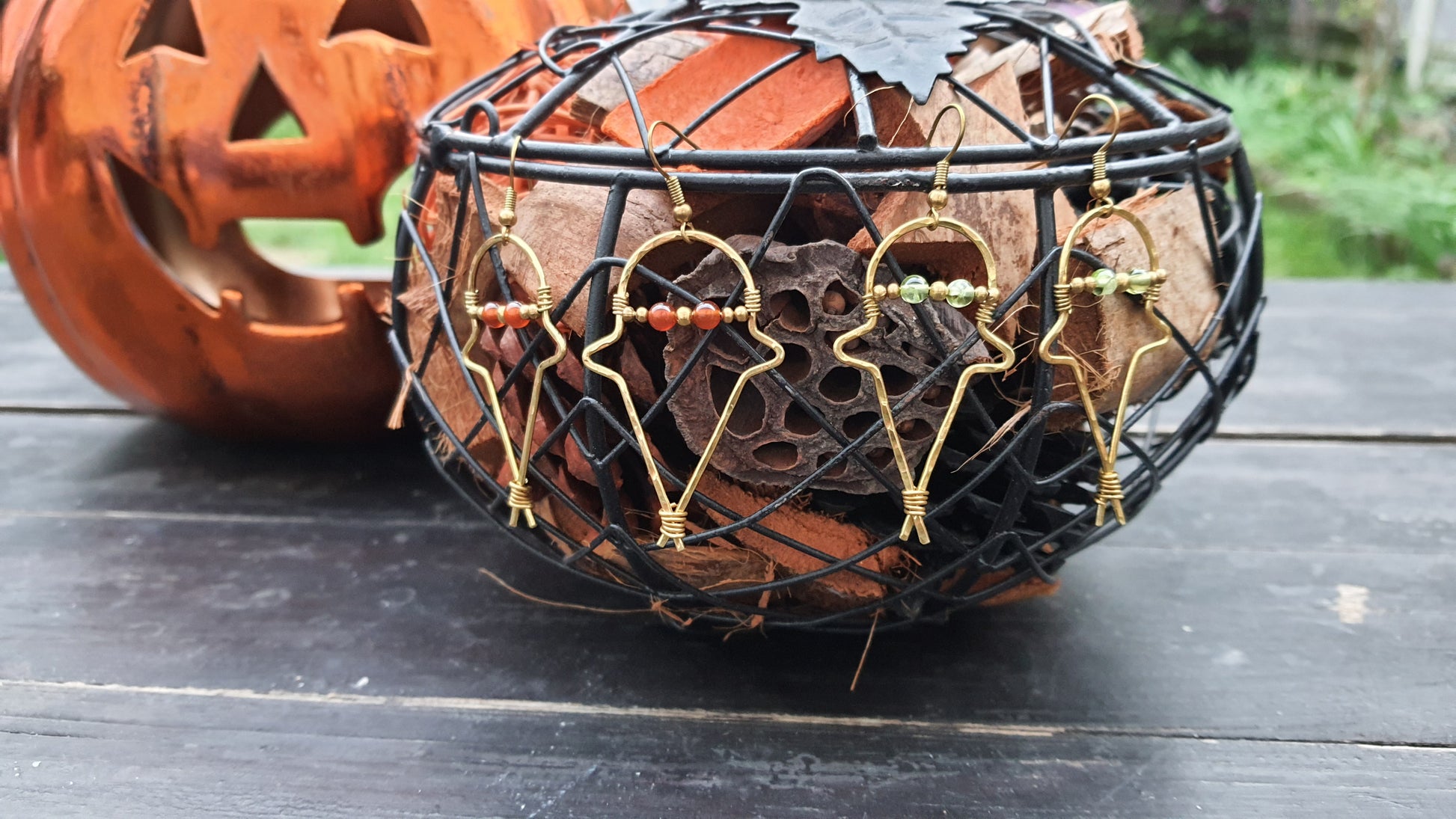 Sculpted by hand, these ghosty earrings are handmade from gold brass wire, gold brass beads, and a pair of 4mm crystal gemstones to add the perfect pop of colour to form the ghost's spooky eyes.