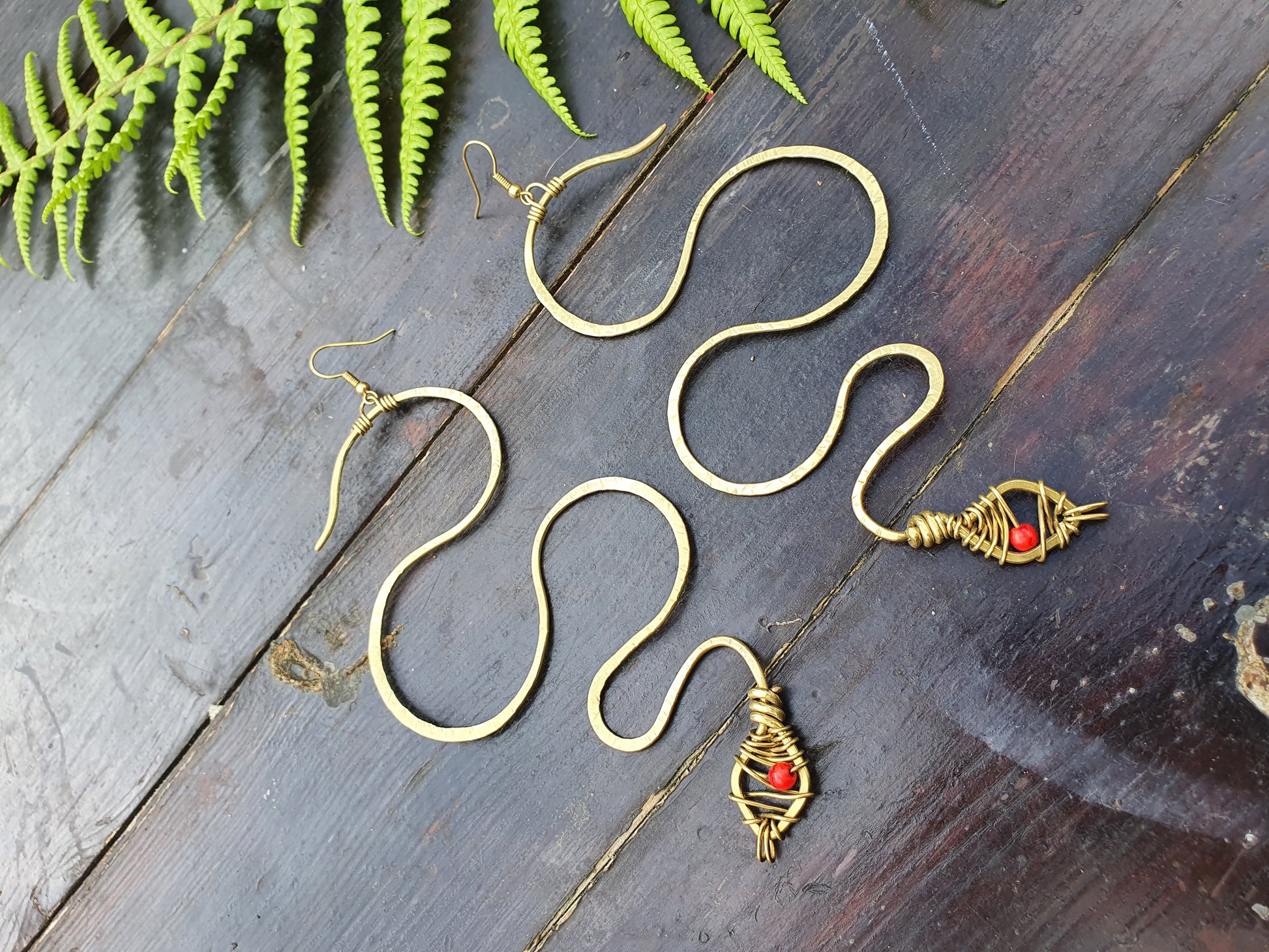 Vibrant, magick red howlite crystals make up the snakes' head adornment in these earrings, and its body is solid brass wire, hammered by hand to leave a delicious textured finish that shines in the light.