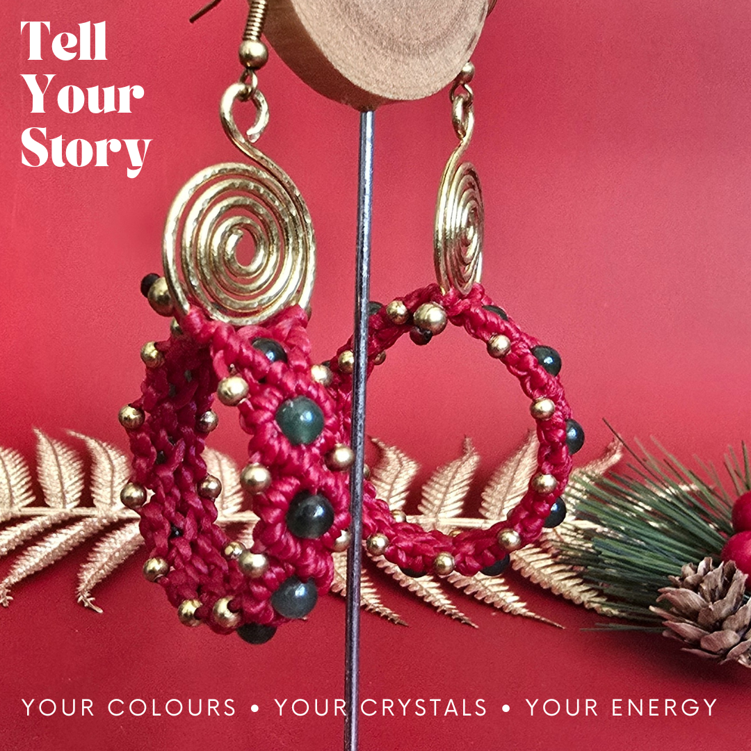 Macrame Christmas Wreath Earrings, Custom Crystal & Cord Colours, Brass Wire Spiral, Handmade Boho Holiday Jewellery, Festive Statement Gift