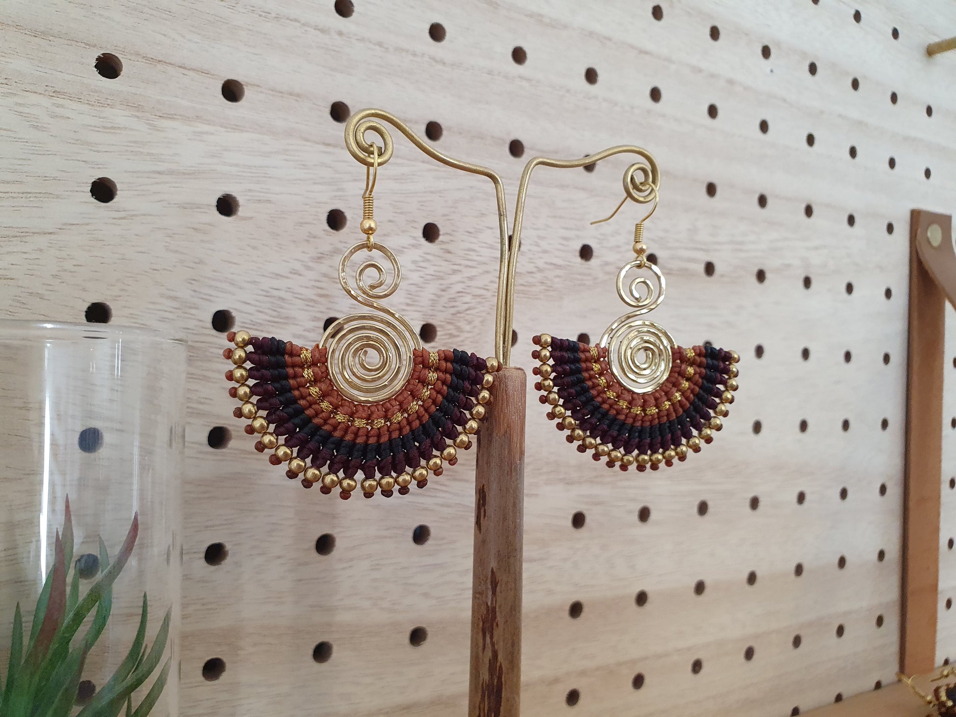 Our classic Egyptian fan macramé earring in gorgeous brown, gold and caramel styling!!