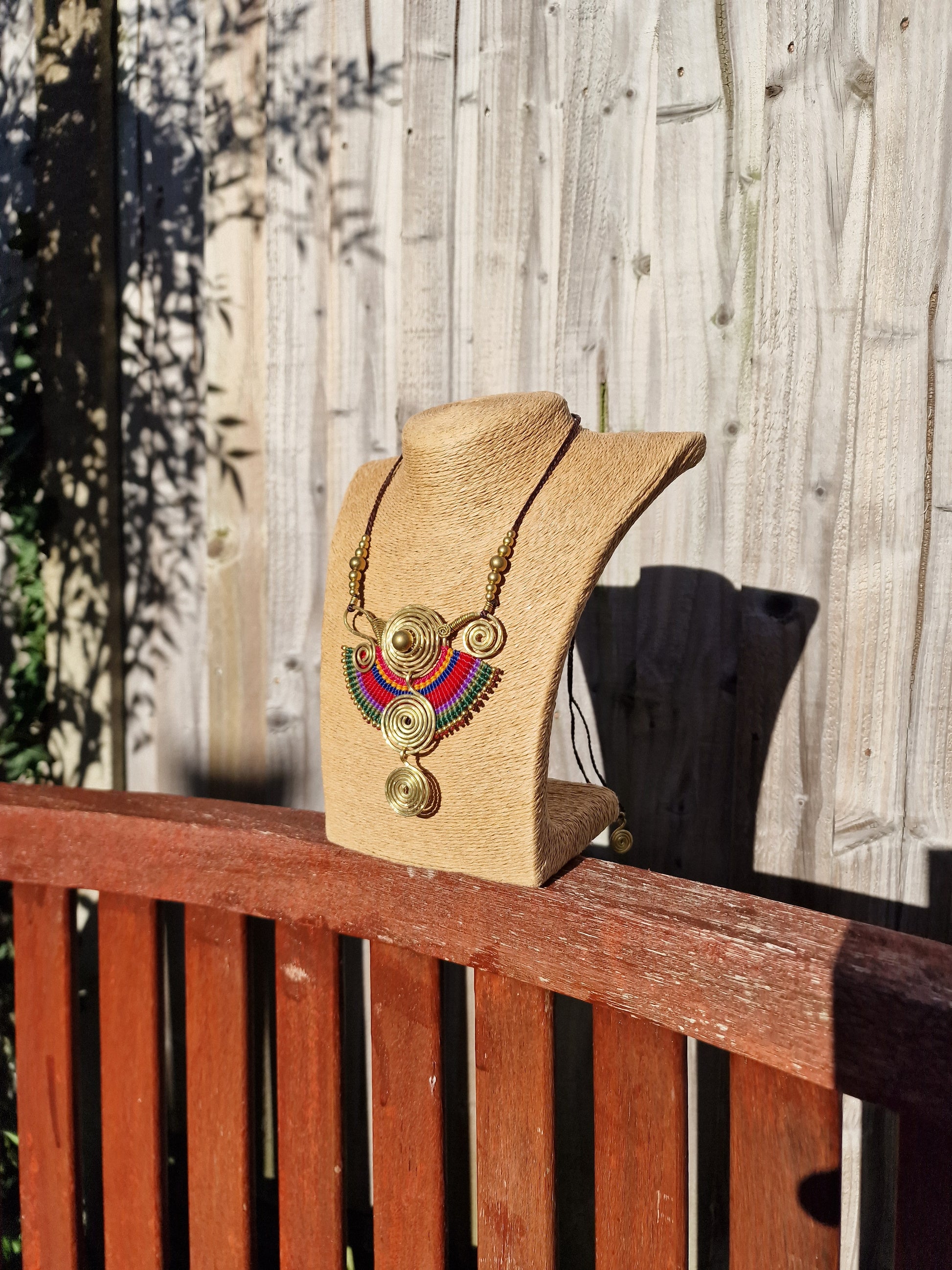 Paying tribute to African ethnic spiral design, this showstopper comprises rainbow waxed cord, skillfully knotted around a trio of golden brass spirals and finished with a mesmarising gold brass stone at its centre. Adorn your neck with art!