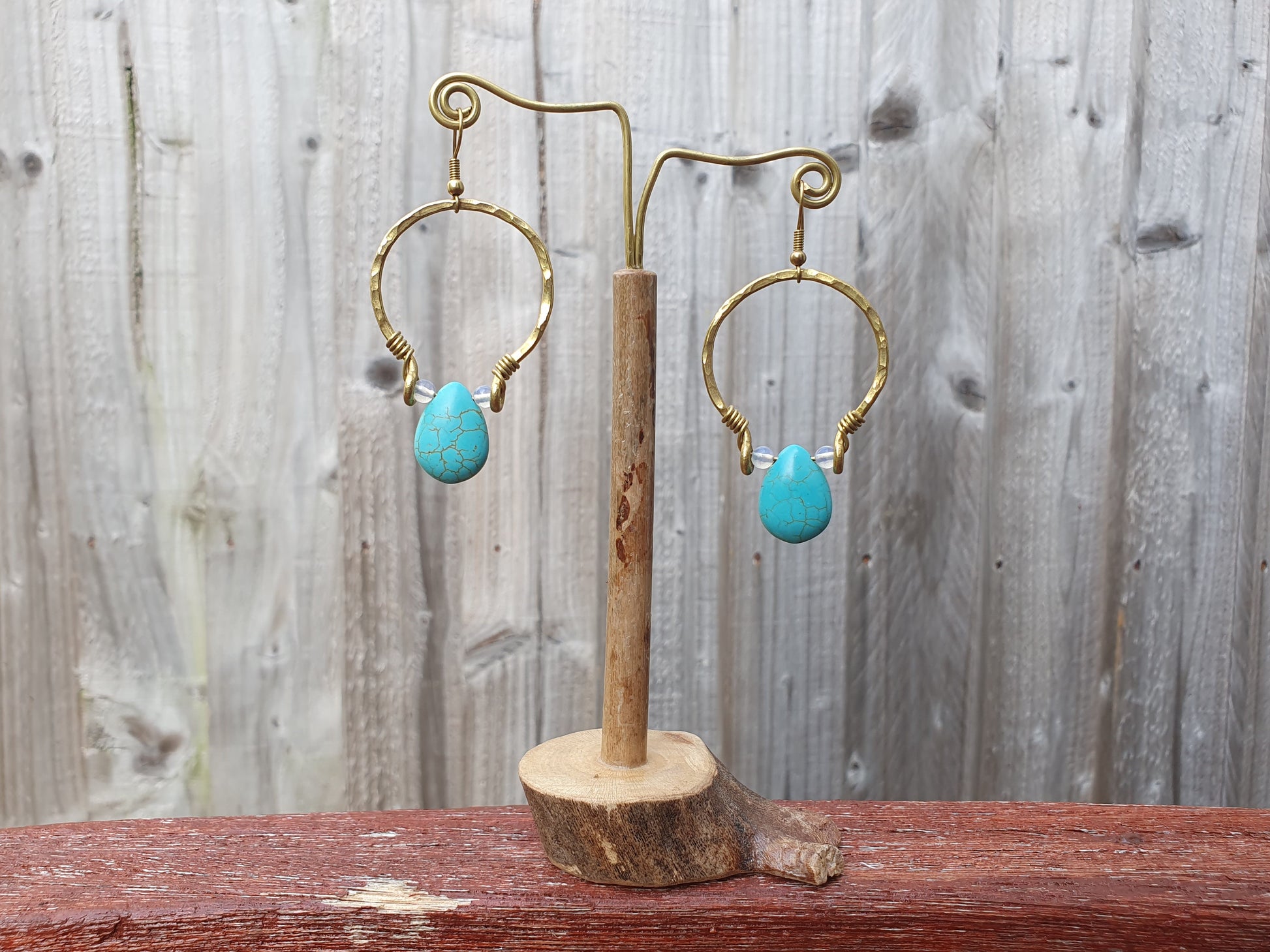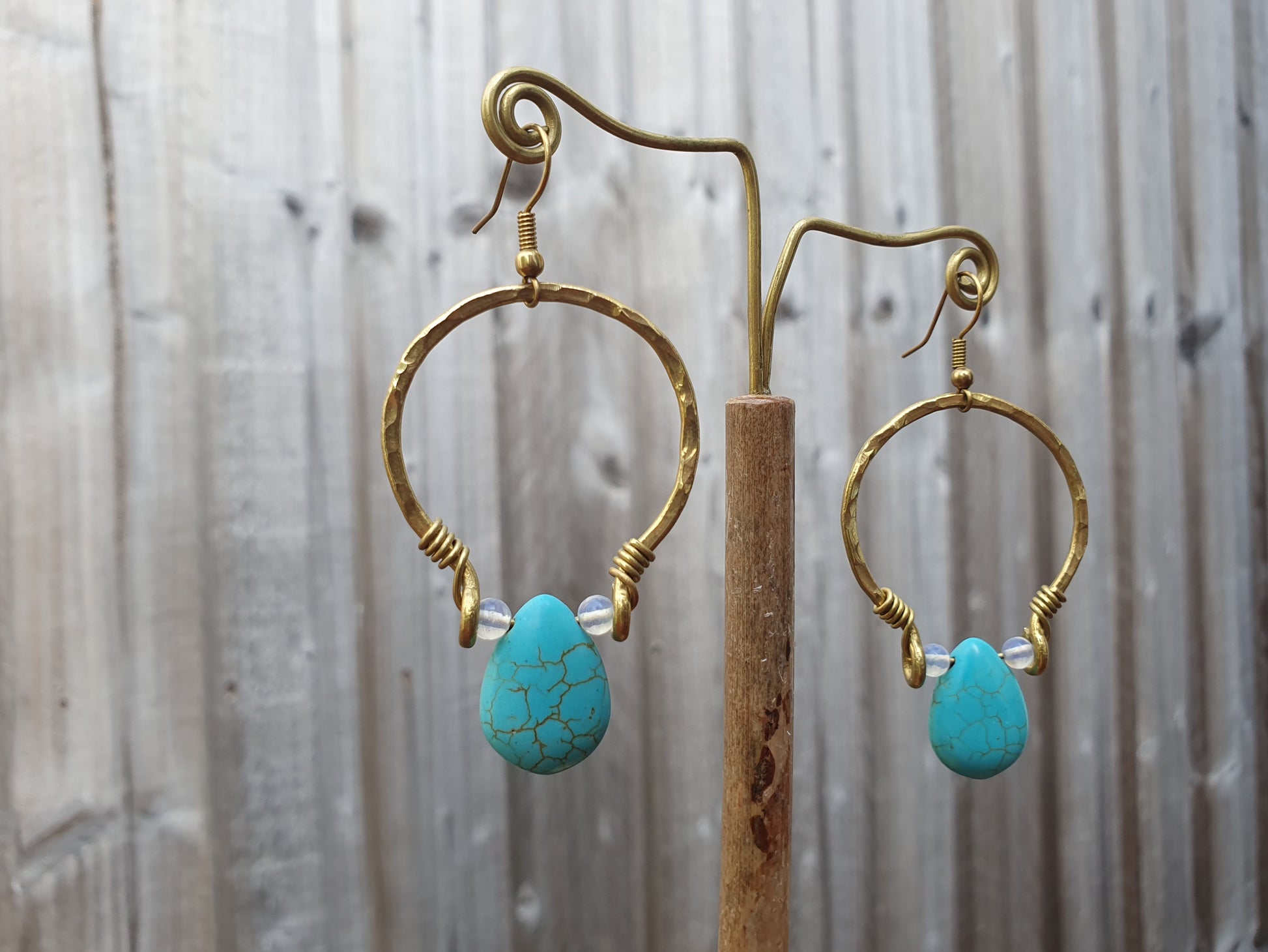 If it's simplicity you'd like, look no further. Perfect gold brass hoops adorned with brass wire detailing, a feature turquoise raindrop stone and flanked either side with small moonstone crystal gemstones. A wonderful and colourful accent for your outfit, from day to night.